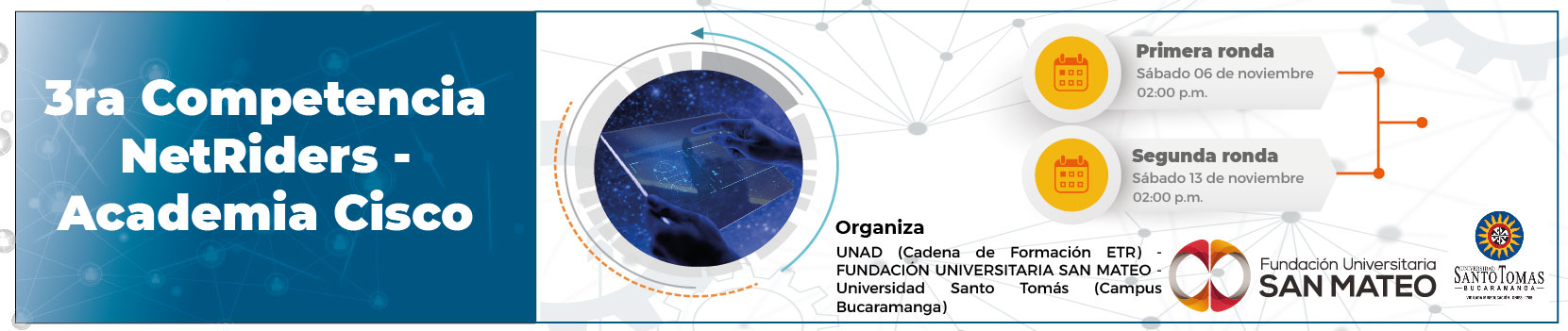 En esta ocasión la 3a Competencia NetRiders - Academia Cisco que ha liderado la Cadena de Formación En Electrónica, Telecomunicaciones y Redes ETR de la UNAD, tendrá como aliado en el equipo organizador a las universidades Fundación Universitaria San Mateo y la Universidad Santo Tomás (Campus Bucaramanga).