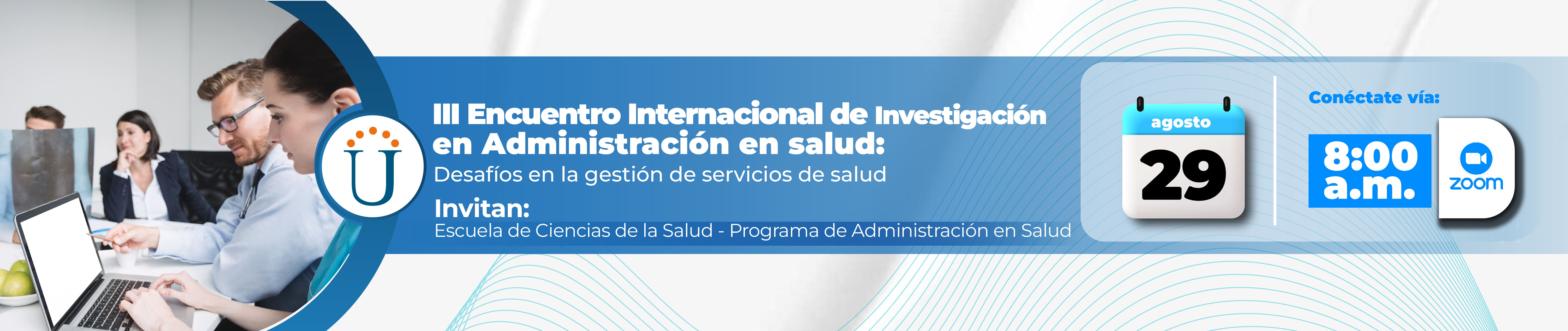 3er Encuentro Internacional de Investigación en Administración en Salud: Desafíos en la Gestión de Servicios de Salud, es organizado por la Escuela Ciencias de la Salud – Programa de Administración en Salud, de la Universidad Nacional Abierta y a Distancia UNAD. Este evento se desarrollará el día 29 de Agosot de 2023 transmisión Zoom, está dirigido a estudiantes, egresados, profesionales en el área de la Administración en Salud y demás público de interés. El desarrollo de este evento académico se tiene como propósito el desarrollo y el fortalecimiento de la investigación que permita identificar necesidades que presentan las instituciones y comunidades de nuestra región, con el fin de contribuir en la búsqueda de soluciones.