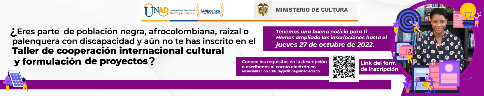 Partcipar en roceso formativo, para la cualificación de población de las comunidades Negras, Afrocolombianas, Raizales y Palenqueras con discapacidad en la comprensión de la cooperación internacional cultural, a partir de un taller e- learning, a través de la plataforma virtual de la Universidad Nacional Abierta y a Distancia UNAD.La comprensión de los aspectos elementales de la cooperación internacional, es uno de los temas más interesantes e importantes del siglo XXI en la medida que permite establecer criterios propios de formación y relación con otras instituciones, entidades gubernamentales, privadas o mixtas a nivel mundial. Para lo cual, es necesario diseñar estrategias que se orienten a afianzar el componente de cooperación a nivel intercultural y que brinde beneficios a los diferentes grupos humanos partícipes de estos procesos.