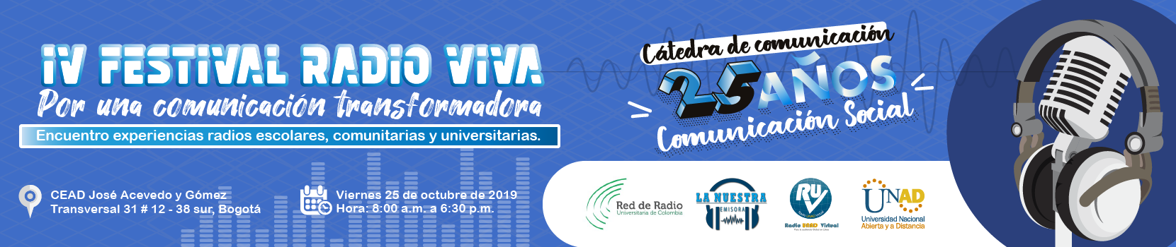 El programa de Comunicación Social de la Universidad Nacional Abierta y a Distancia –UNAD– se encuentra ad-portas de realizar la octava edición de la Cátedra de Comunicación y la celebración de los 25 años del programa. En el marco de dicho evento académico, la comunidad educativa del Programa en Bogotá llevará a cabo la actividad cultural y de proyección social –Cuarto Festival de Radio, «Radio Viva»