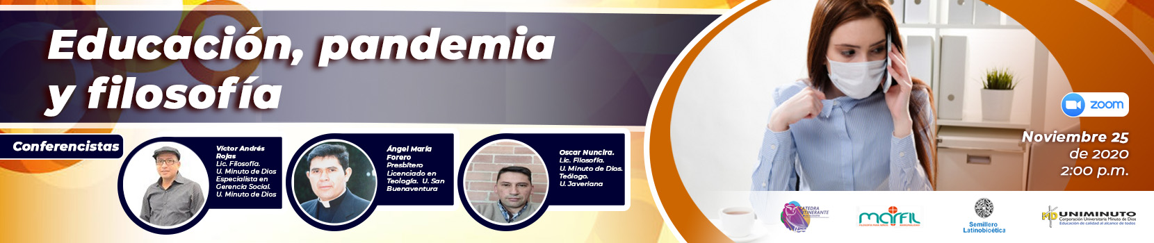 En esta oportunidad el tema será: “Educación, pandemia y filosofía”. El propósito es promover la reflexión filosófica en torno a problemáticas sociales, educativas e institucionales, desde la actual coyuntura de pandemia que afecta tanto global como localmente a la sociedad, la educación, la economía y la salud, entre otras. El espacio académico permitirá analizar algunos elementos del manejo de la pandemia de 1918 frente actual situación, en un contexto regional en el ámbito educativo en relación con la necesidad de filosofar como mecanismo que ofrece herramientas éticas y bioéticas en la toma de decisiones para asumir la vida en este momento histórico.