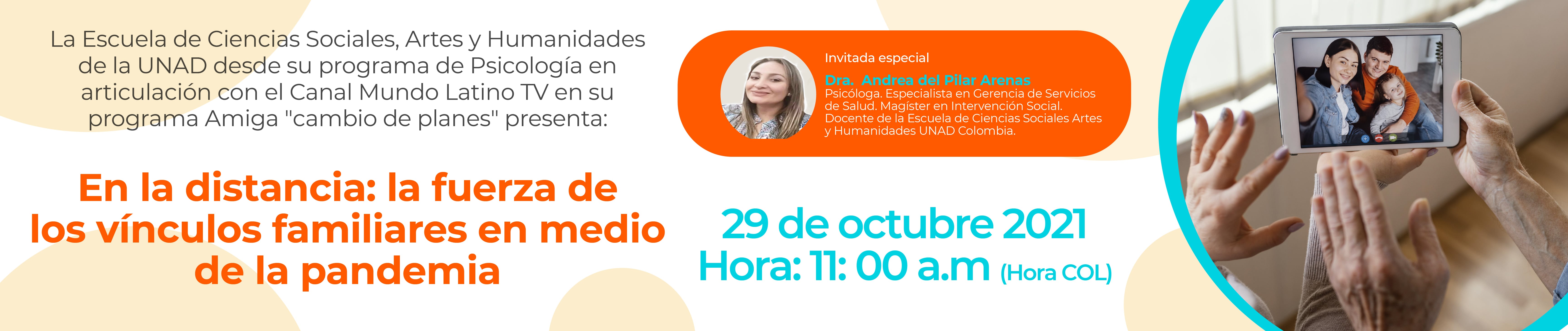 La escuela de Ciencias Sociales Artes y Humanidades de la Universidad Nacional Abierta y a Distancia – UNAD en articulación con el canal Mundo Latino TV de la ciudad de Houston estado de Texas EE UU y su programa amigas Cambios de Planes bajo la dirección de la Dra. Claudia Ramón quieren aportar a toda la comunidad latina residente en el exterior y en otros países latinos donde el canal tiene sus alcances; temáticas que desde la psicología aporten a la salud mental y bienestar integral del individuo y su familia en tiempos de pandemia.