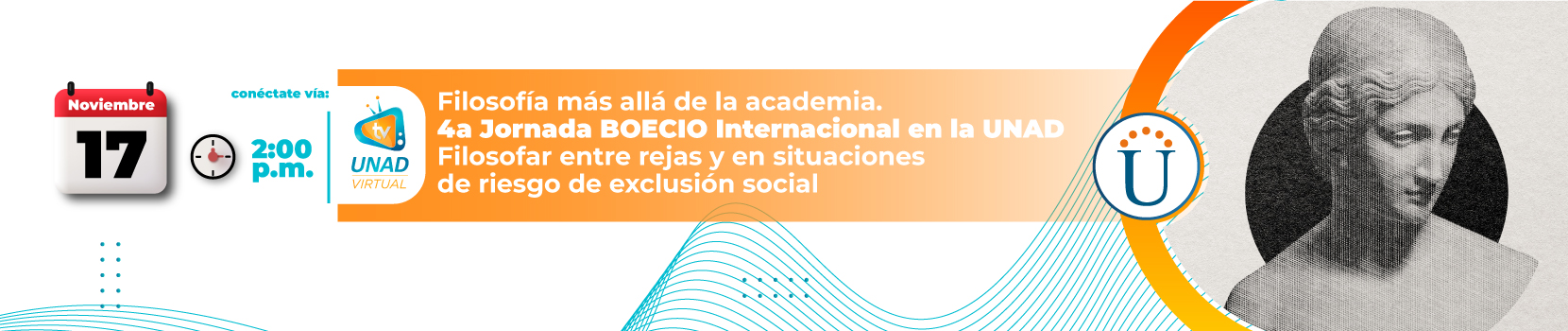 Con motivo de la celebración del día mundial de la filosofía. Desde la Licenciatura en Filosofía de la UNAD, así como los proyectos de divulgación del PIE 071 LIFI ECEDU, este evento tiene como objeto desarrollar una serie de conferencias y paneles denominada I Jormada BOECIO Internacional en la UNAD en torno a Filosofar entre rejas y en situaciones de riesgo de exclusión social con el fin de difundir otras perspectivas y formas de filosofar en escenarios diversos fuera de la cademia.