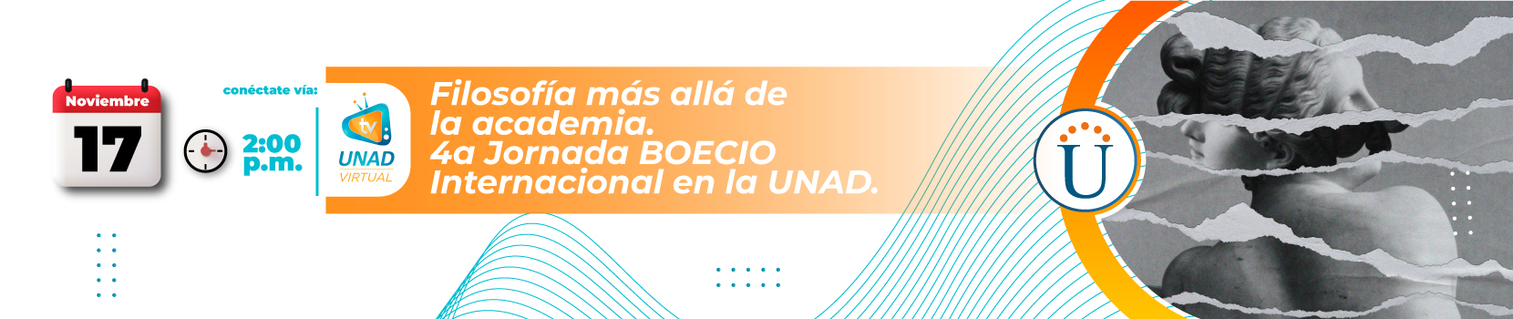 Con motivo de la celebración del día mundial de la filosofía. Desde la Licenciatura en Filosofía de la UNAD, así como los proyectos de divulgación del PIE 071 LIFI ECEDU, este evento tiene como objeto desarrollar una serie de conferencias y paneles denominada 1era Jornada BOECIO Internacional en la UNAD en torno a Filosofar entre rejas y en situaciones de riesgo de exclusión social con el fin de difundir otras perspectivas y formas de filosofar en escenarios diversos fuera de la cademia.