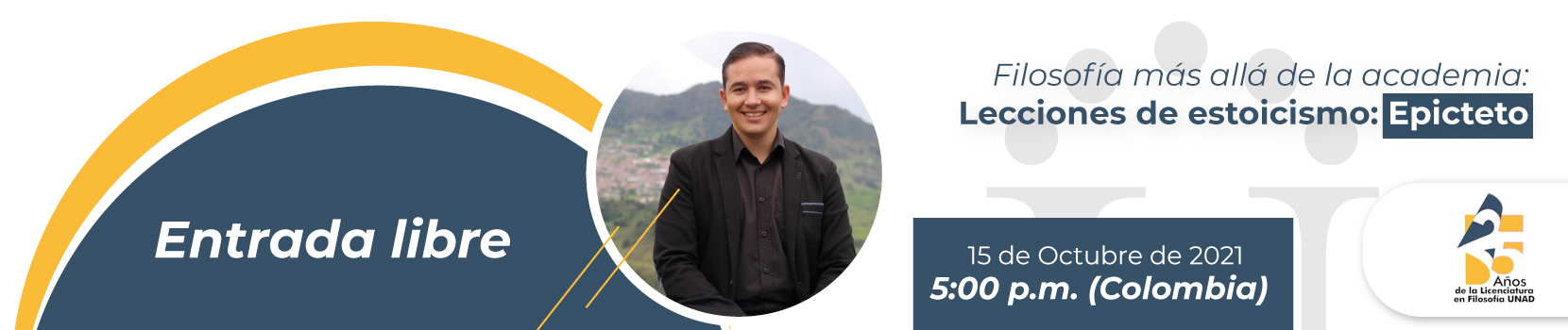 Con motivo de la conmemoración y celebración de los 25 años de la Licenciatura en Filosofía de la UNAD, así como los proyectos de divulgación del PIE 071 LIFI ECEDU y del Semillero de Investigación INEDUC -adscrito al grupo AMECI- , este evento tiene como objeto invitar al profesor Yuner Ismar Flórez Eusse a impartir una conferencia académica sobre Epicteto.