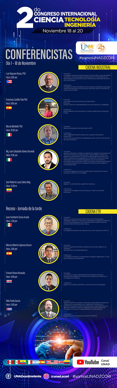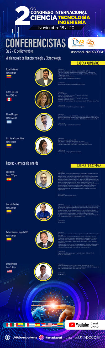 II CONGRESO INTERNACIONAL DE CIENCIA, TECNOLOGÍA E INGENIERÍA – ZCORI 2021 será un espacio en el cual se compartirán experiencias y hallazgos de investigaciones en ciencia, tecnología e ingeniería, de expertos e investigadores a nivel nacional e internacional con la comunidad UNADISTA, empresarios, profesionales y egresados.