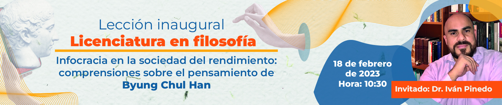 La lección inaugural es un espacio importante para nuestra licenciatura en filosofía, en el que se lleva a los estudiantes, y comunidad en general, a la reflexión sobre diversos temas que tienen influencia en la manera en la que se entiende la vida en la actualidad, así como en los elementos que de la filosofía enriquecen la comprensión y el hecho educativo. Para esta ocasión, en el periodo 1601/2023, nos acompañará el Dr. Iván Pinedo, profesor de nuestra licenciatura, con una charla denominada Infocracia en la sociedad del rendimiento: comprensiones sobre el pensamiento de Byung Chul Han,