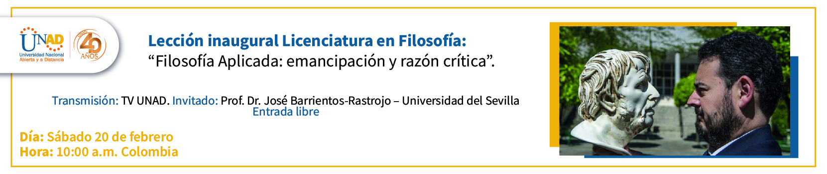 Las lecciones inaugurales son espacios de difusión y debate académico en el cual se da apertura a un período académico. En este caso, se abordarán temas propios de la filosofía práctica y aplicada obedenciendo a una de las líneas de investigación de la Licenciatura en Filosofía UNAD, así como a su compromiso de celebrar con los estudiantes espacios de reflexión que motiven el inicio de su período académico. Y, también, yendo más allá de la academia misma, a todos aquellos interesados en temas de divulgación filosófica.