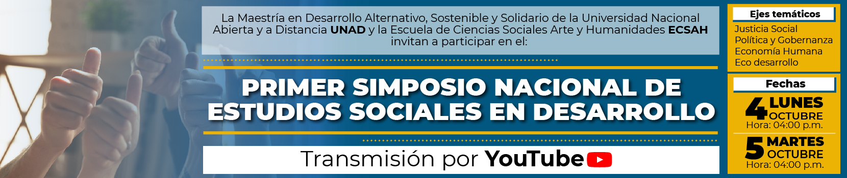 La Maestría en Desarrollo Alternativo, Sostenible y Solidario de la Universidad Nacional Abierta y a Distancia UNAD y la Escuela de Ciencias Sociales Arte y Humanidades ECSAH invitan a participar en el Primer Simposio Nacional de Estudios Sociales del Desarrollo.