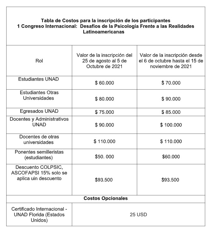 Para ampliar la información puede escribir al correo del evento: congreso.psicologia@unad.edu.co