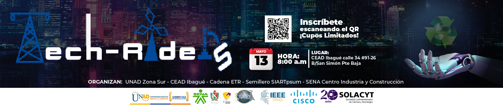 El Evento Tech Riders es una iniciativa liderada por el Semillero de Investigación de Ingeniería Aplicada en Robótica y Telecomunicaciones SIART, del Grupo de Investigación GIDESTEC, con el equipo docente de la Cadena de Formación en Electrónica, Telecomunicaciones y Redes ETR de la Zona Sur CEAD Ibagué; que abarca temáticas articuladas a los objetos de estudio de los programas de la Cadena de Formación ETR como son: Redes, Robótica y Energías Renovables, articulando la Academia, Gobierno y Sector Productivo, a través de conferencia, concurso de robótica y redes, conversatorio con sector productivo, gobierno y academia, workshops y talleres;