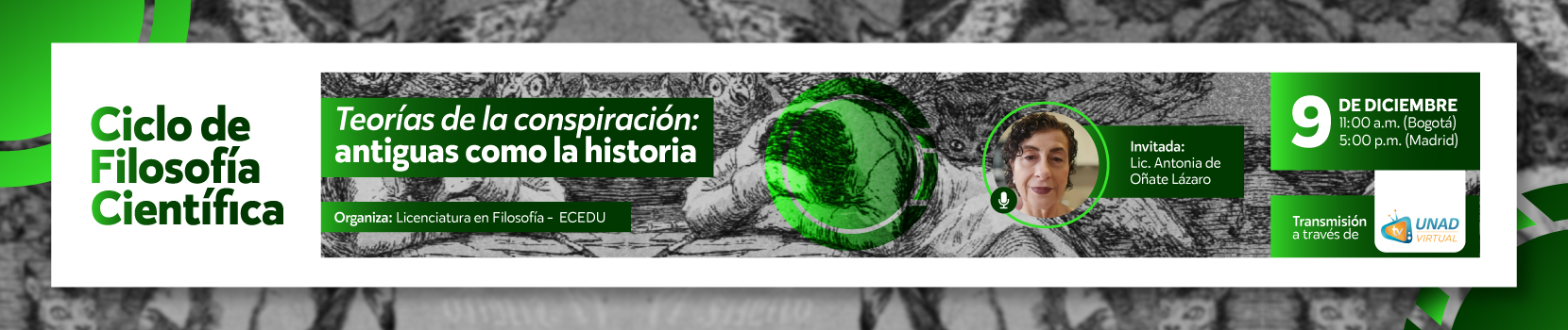 Con motivo de promover el Proyecto de Investigación – aprobado en la convocatoria 14–: Cartografía de Saberes: Diagnóstico de la Formación Docente en Big History en Bogotá, Colombia, el Ciclo de Filosofía Científica tiene como propósito promover la filosofía científicamente informada (naturalismo filosófico), realizando programas de divulgación de temas propios de esta rama de la filosofía, así como de asuntos de tipo científico que puedan nutrir las investigaciones propias del naturalismo filosófico. Para esta ocasión se convoca a la comunidad universitaria a participar de la conferencia “Teorías de la conspiración: antiguas como la historia” a cargo de la Lic. Antonia de Oñate Lázaro.