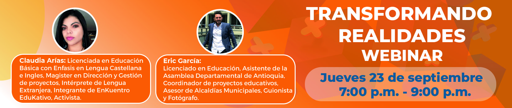 El conversatorio "Transformando realidades", impartida por Claudia Arías y Eric García muestra los distintos contextos educativos, culturales y políticos que se presentan en Colombia desde una mirada arraigada a los territorios y escenarios que viven nuestros ponentes en su día a día para poder generar reflexiones que permitan cambiar las realidades territoriales con el objetivo de construir un país en paz.