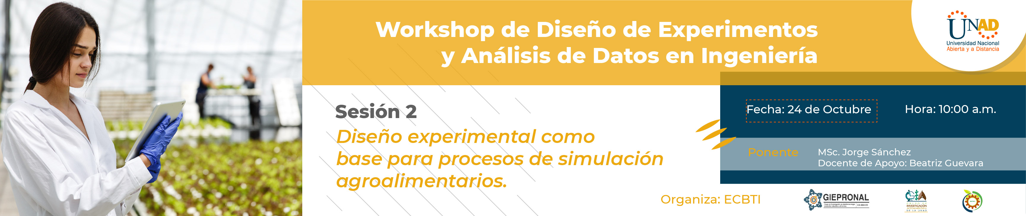 El Workshop de Diseño de Experimentos y Análisis de Datos en Ingeniería será un espacio para conceptualizar y actualizar a la comunidad Unadista y público en general la importancia y aplicaciones del diseño de experimentos y análisis de datos en la ingeniería y los avances tecnológicos que de esta se derivan. También se busca exponer diferentes actividades de investigación realizadas al interior de los Semilleros, articulados al contenido curricular de los diferentes programas de la Cadena de Formación en Alimentos.