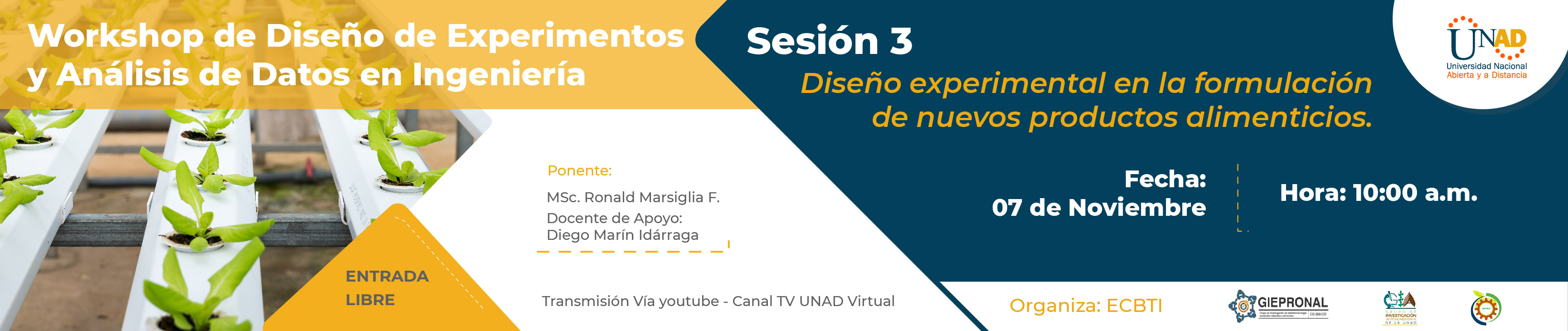 El Workshop de Diseño de Experimentos y Análisis de Datos en Ingeniería será un espacio para conceptualizar y actualizar a la comunidad Unadista y público en general la importancia y aplicaciones del diseño de experimentos y análisis de datos en la ingeniería y los avances tecnológicos que de esta se derivan. También se busca exponer diferentes actividades de investigación realizadas al interior de los Semilleros, articulados al contenido curricular de los diferentes programas de la Cadena de Formación en Alimentos.